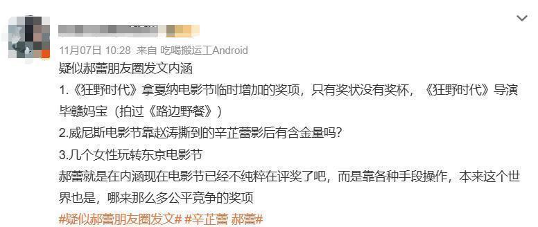11 月 7 日,# 辛芷蕾 六连问# #威尼斯影后 含金量# 等话题强势霸占全网热搜 TOP3,阅读量单日破 10 亿。这场舆论风暴的导火索,是一张疯传的署名 “郝蕾” 的朋友圈截图。