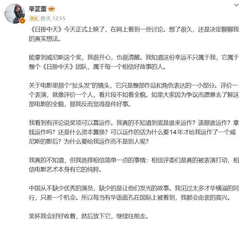 电影圈专业人士也纷纷发声,导演蔡尚君强调 “那个‘扯头发’片段是角色情绪爆发的关键转折,长镜头下的表演难度极高,是整部电影的点睛之笔”。而威尼斯电影节组委会早已给出官方定论:“辛芷蕾是近 10 年最佳影后”。二、辛芷蕾霸气回怼:六连反问戳穿质疑软肋面对愈演愈烈的争议,辛芷蕾选择在《日挂中天》上映当天正面硬刚。一篇长文回应堪称 “教科书级危机公关”。
